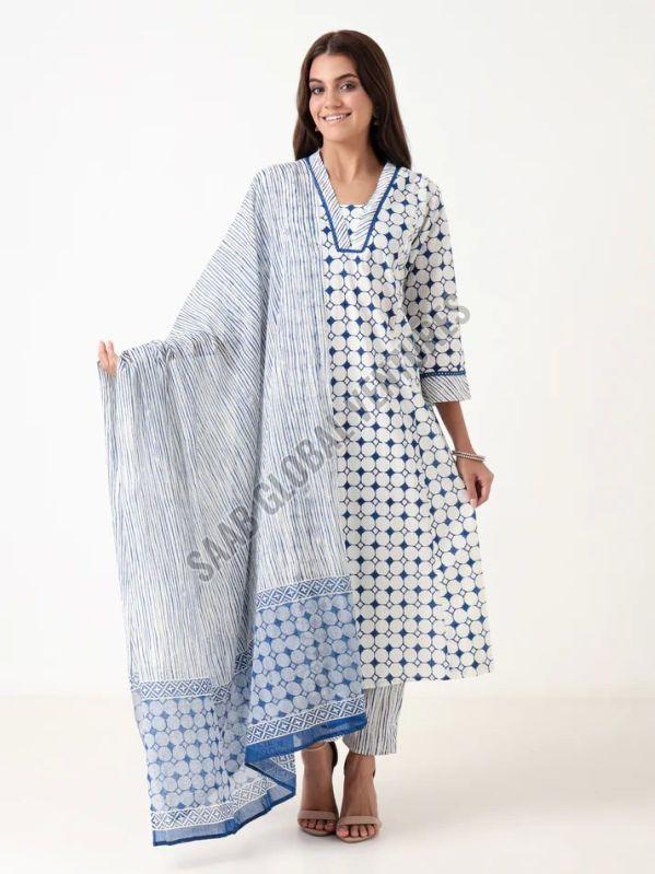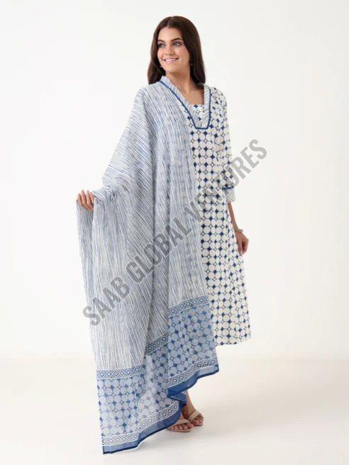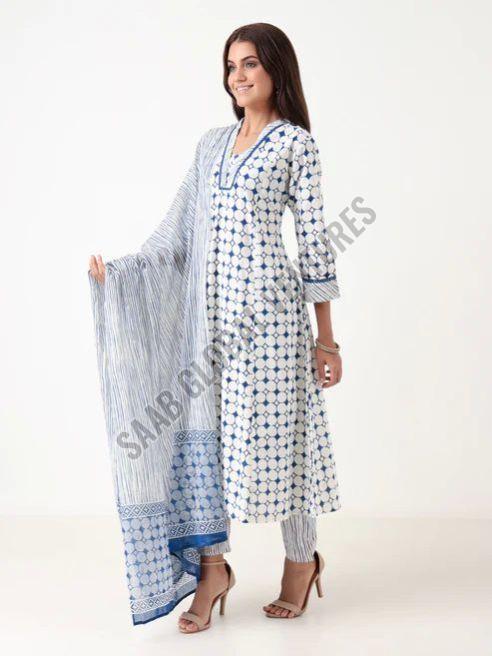 The designer V-neckline, three-quarter sleeves, and calf-length Anarkali silhouette flatter all body types, while the coordinated bottomwear and matching printed dupatta complete the look with subtle grace. Ideal for sunlit brunches, casual gatherings, or laid-back festive days, this set captures the calm of a summer evening under a blue moon.