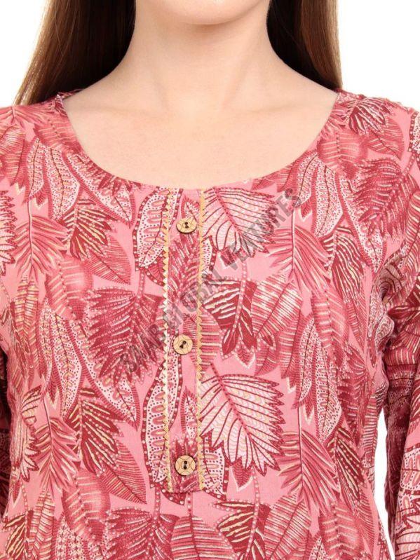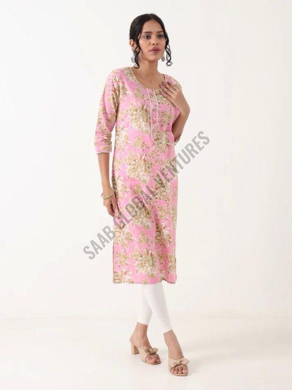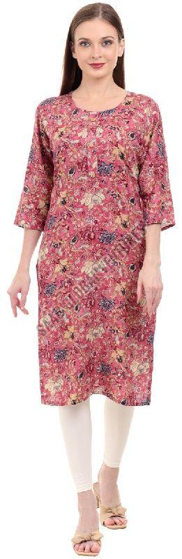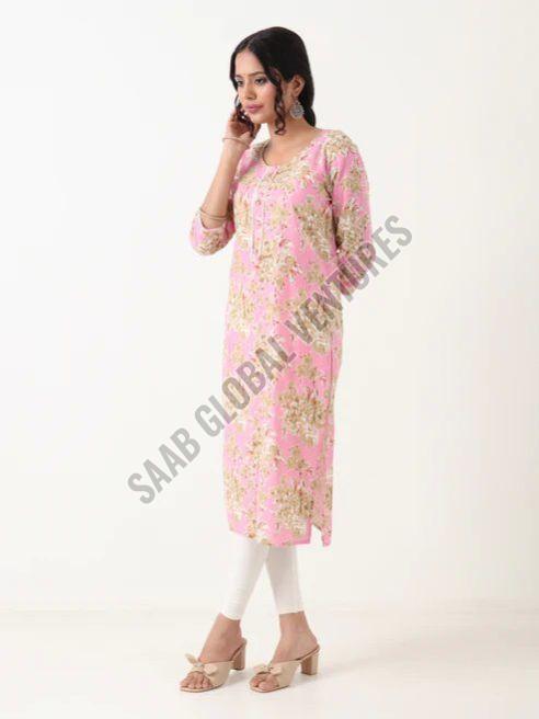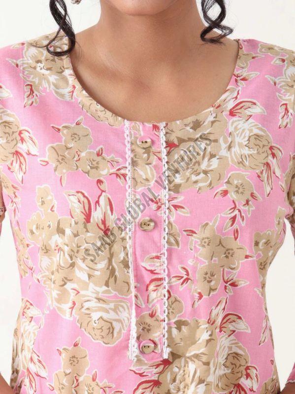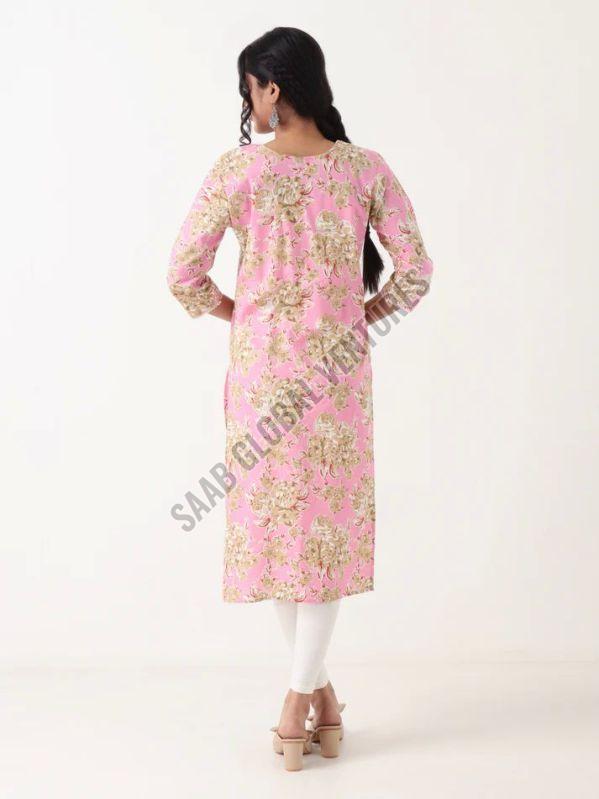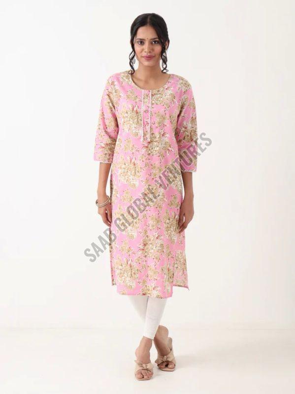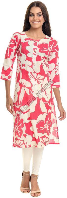 This beautiful pink cotton kurti features an all-over floral print in soft, refreshing tones, making it perfect for summer. Designed in a flattering A-line silhouette, it falls gracefully to calf length and includes three-quarter sleeves for an elegant, easygoing feel. The round neckline adds a classic finish, making it suitable for both casual days and relaxed office wear.
