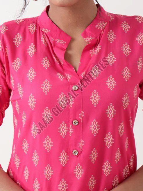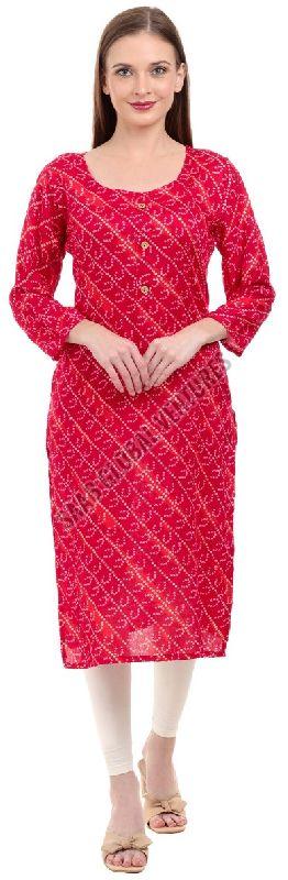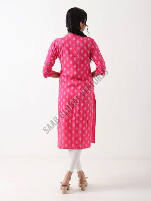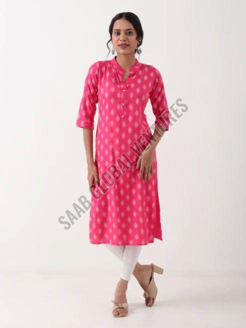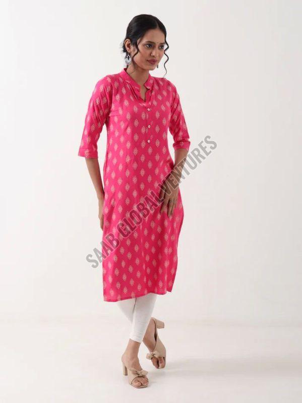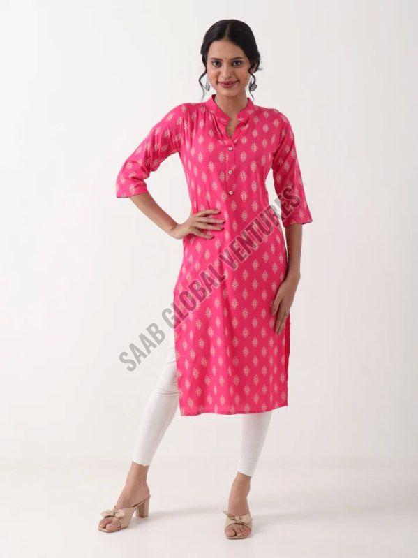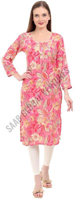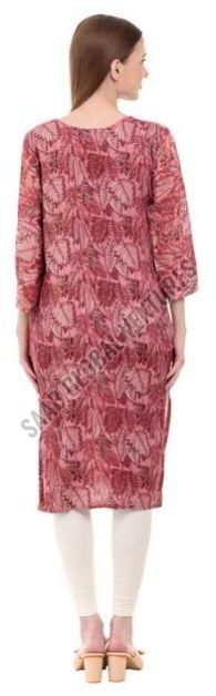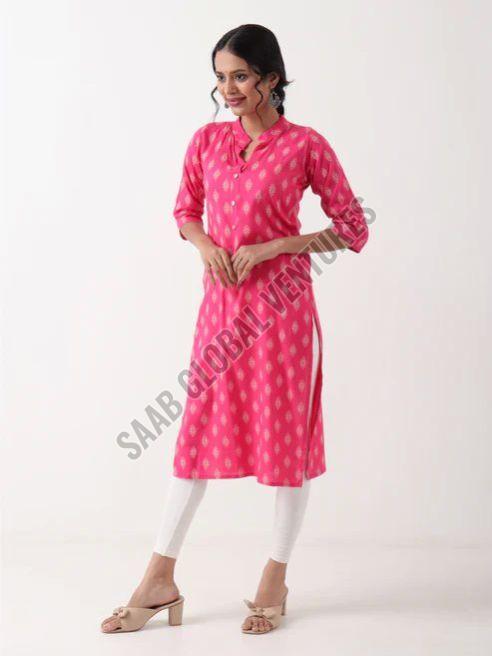 This beautiful pink cotton kurti features an all-over floral print in soft, refreshing tones, making it perfect for summer. Designed in a flattering A-line silhouette, it falls gracefully to calf length and includes three-quarter sleeves for an elegant, easygoing feel. The round neckline adds a classic finish, making it suitable for both casual days and relaxed office wear.