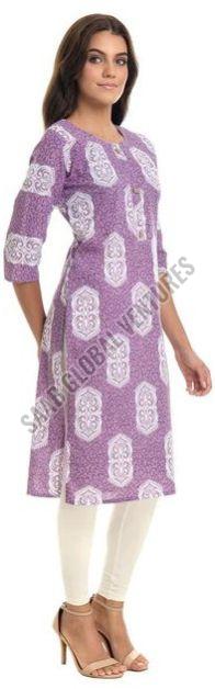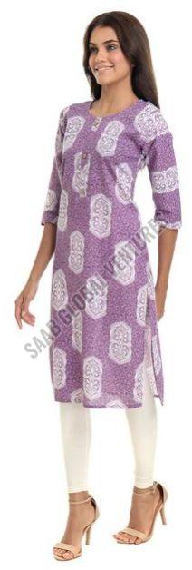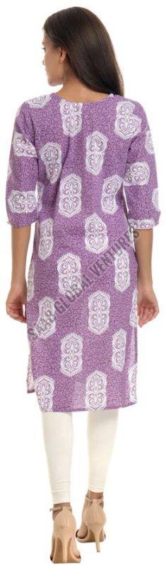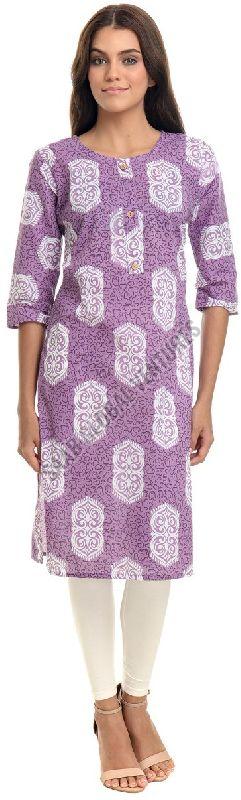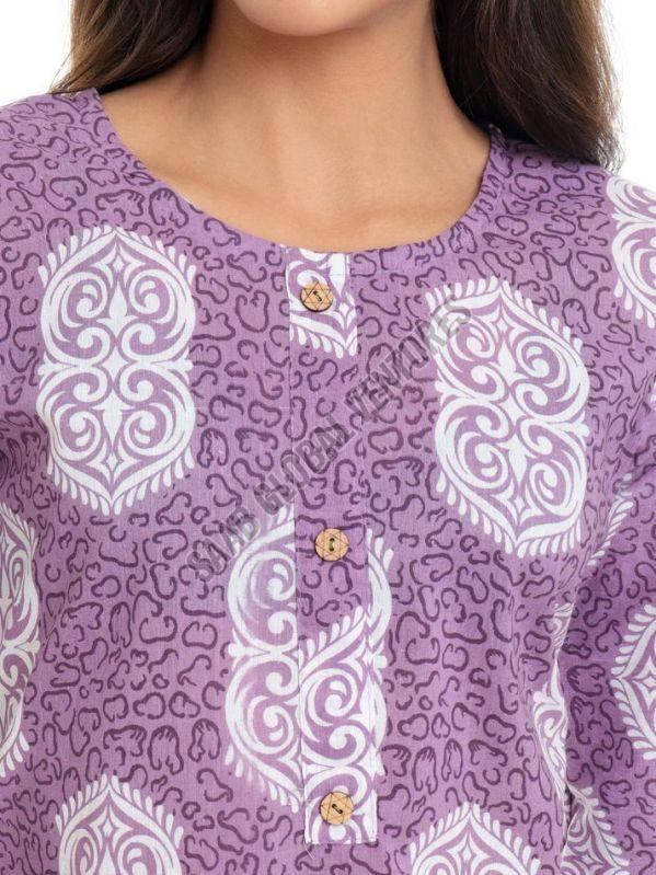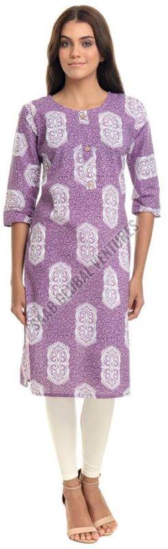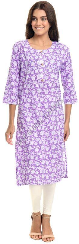 Crafted from pure cotton, this A-line knee-length kurti ensures comfort and breathability, making it a beautiful pick for summer days. The soft purple hue paired with delicate white floral prints offers a fresh, feminine appeal, while the round neckline and three-quarter sleeves keep the look timeless and versatile.