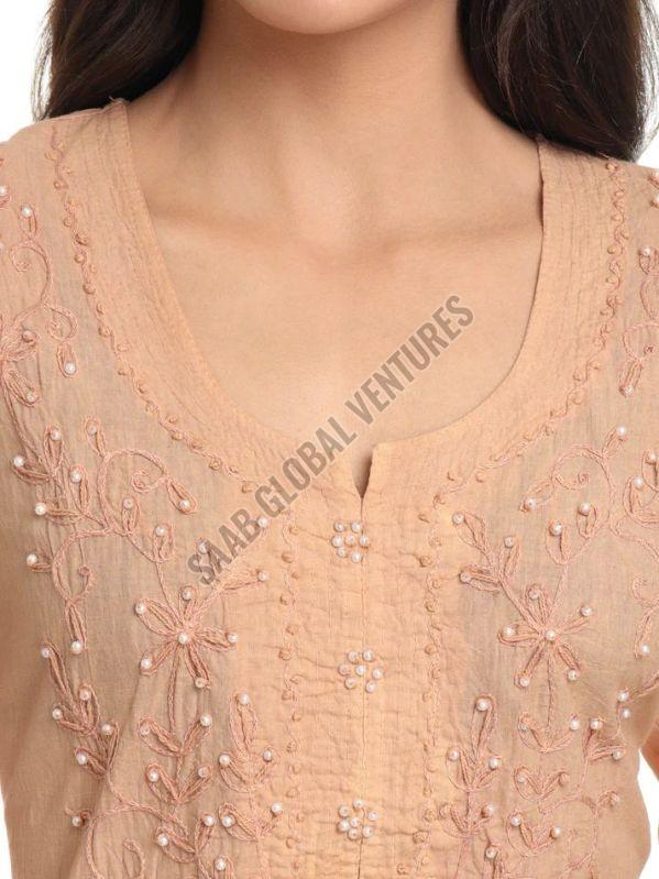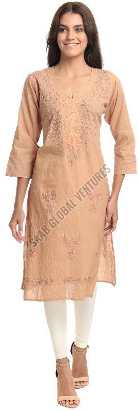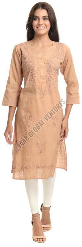 Varnnan Beige Elegance Chikankari Kurti - Step into timeless grace with the Varnnan Beige Elegance Chikankari Kurti, a beautiful blend of tradition and minimal charm. Crafted from pure cotton, this A-line kurti features exquisite chikankari embroidery delicately enhanced with pearl accents that elevate its classic beige tone. Designed with a flattering round neck and three-quarter sleeves, this kurti is both elegant and breathable—perfect for long summer days or festive gatherings.
