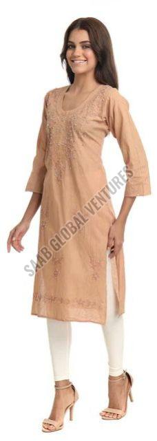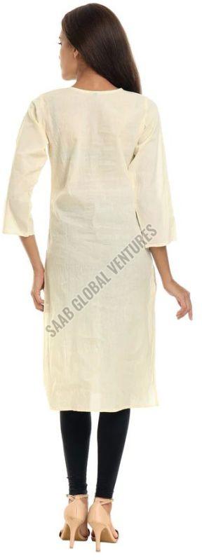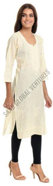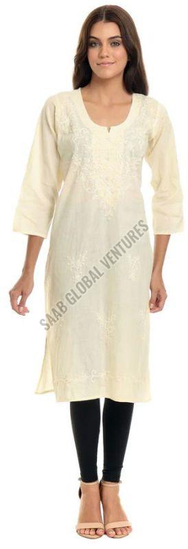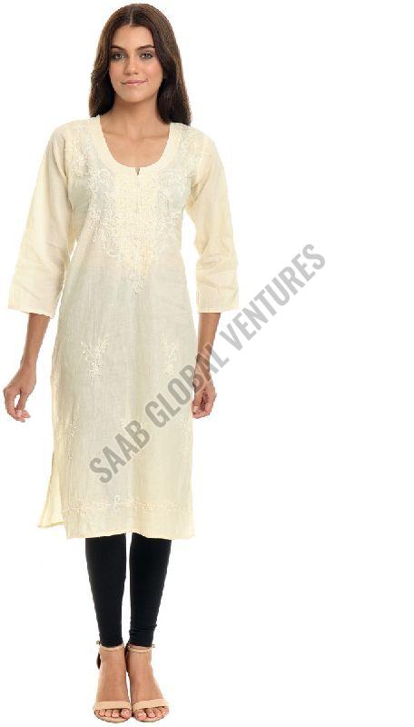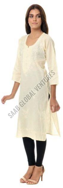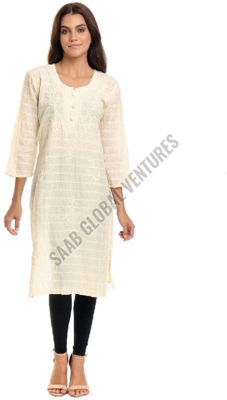 Featuring an off-white base, it is adorned with delicate Chikankari embroidery, showcasing the rich heritage of Indian handwork. The A-line silhouette, knee-length hem, and three-quarter sleeves offer a flattering shape that suits all body types. A simple yet classic round neckline adds to its versatile charm, making it a must-have piece for every woman’s ethnic wardrobe.