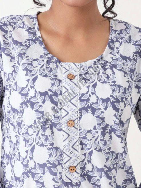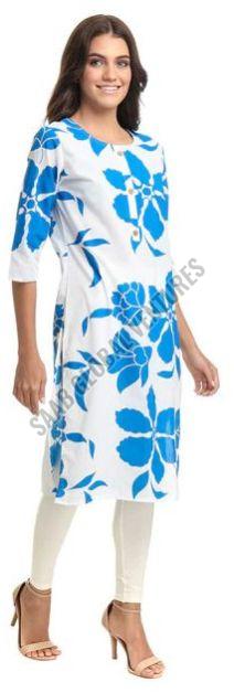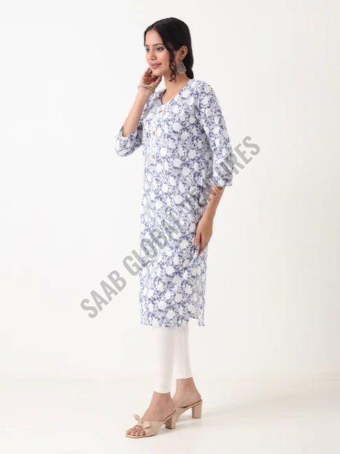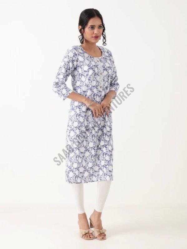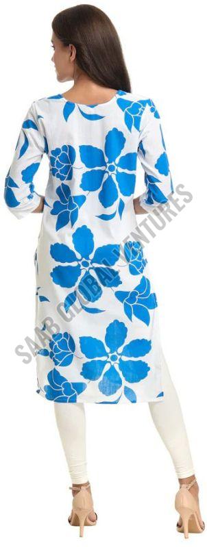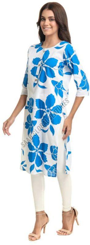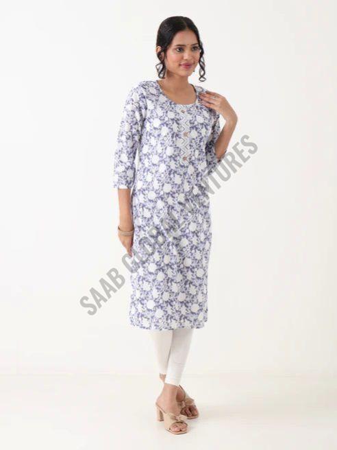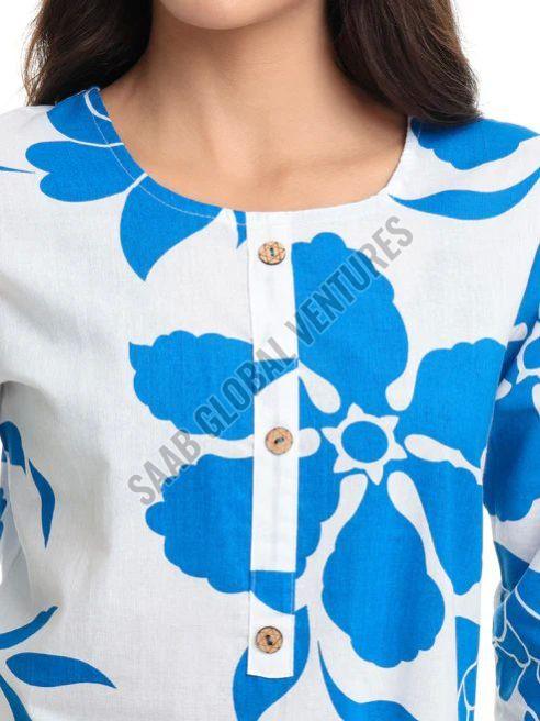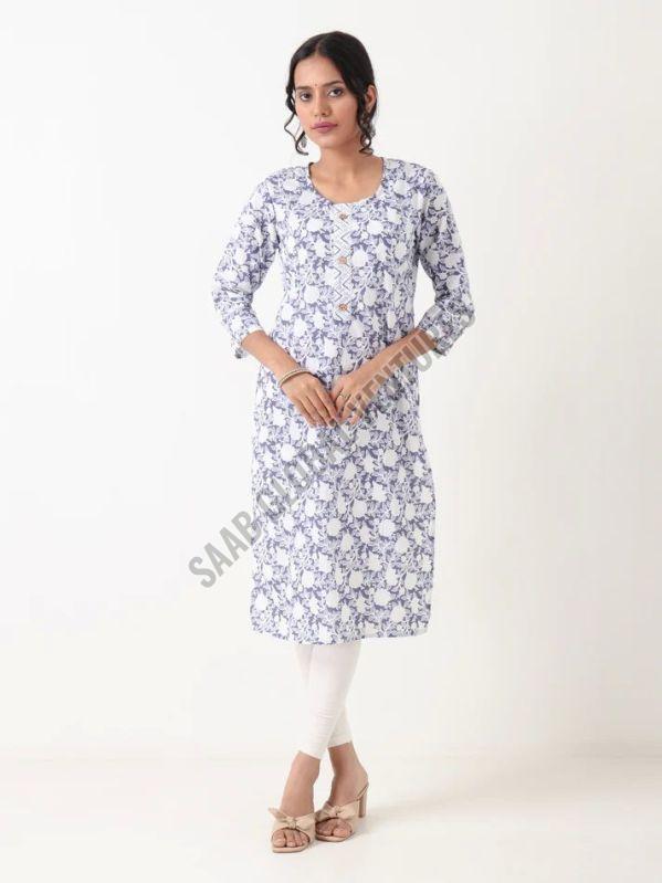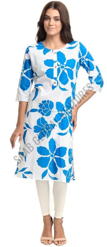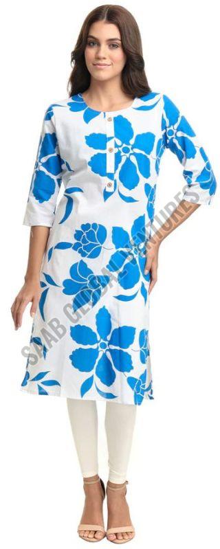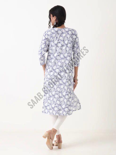 Crafted from 100% pure cotton, this A-line knee-length kurti features a pristine white base beautifully accented with soft blue floral prints. Designed with a classic round neck and three-quarter sleeves, it’s perfect for those who appreciate subtle sophistication with a seasonal charm.