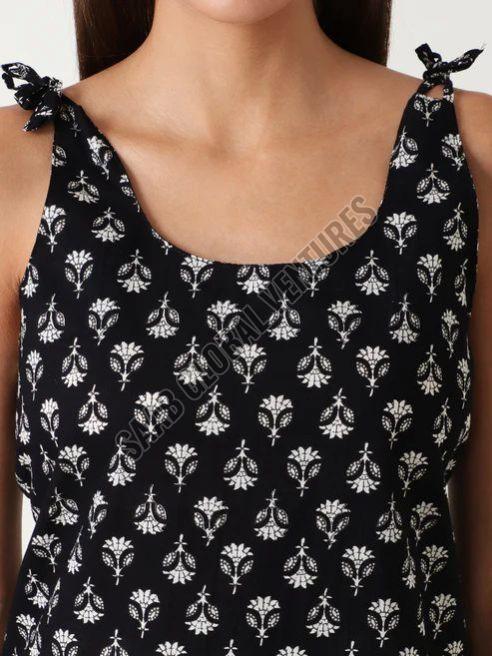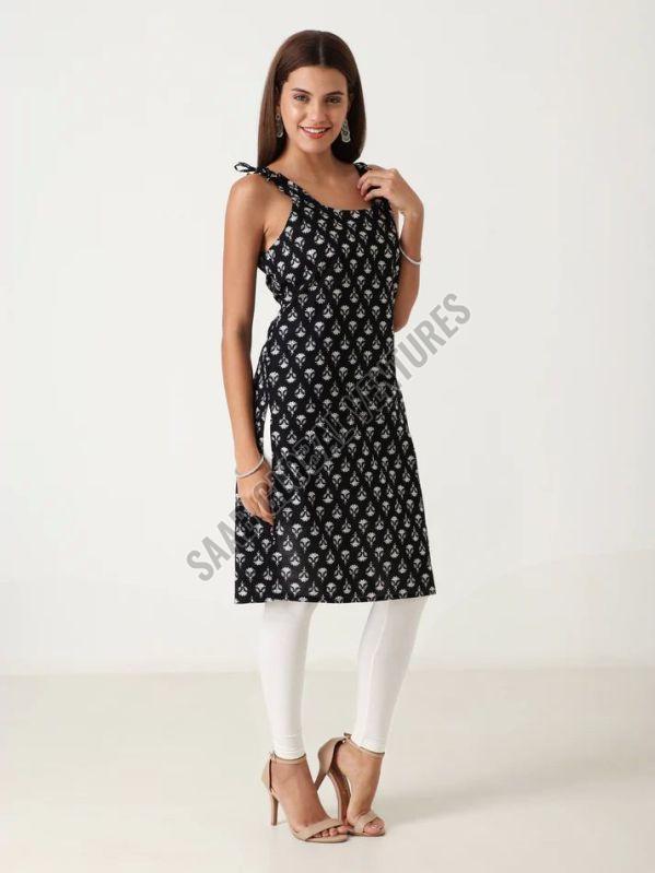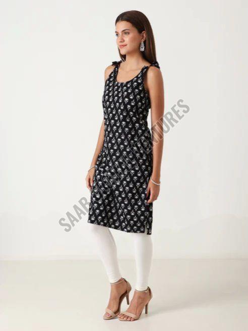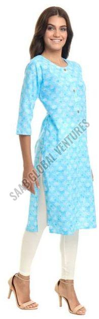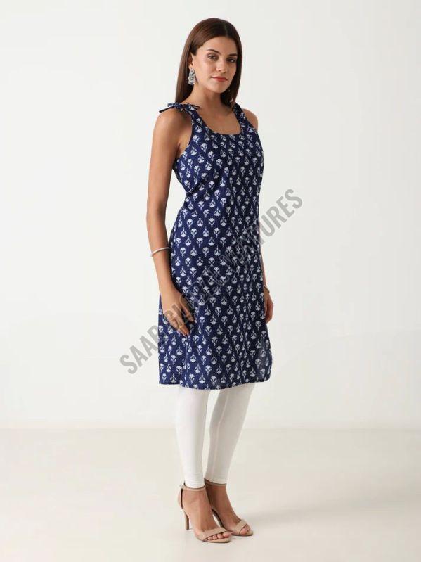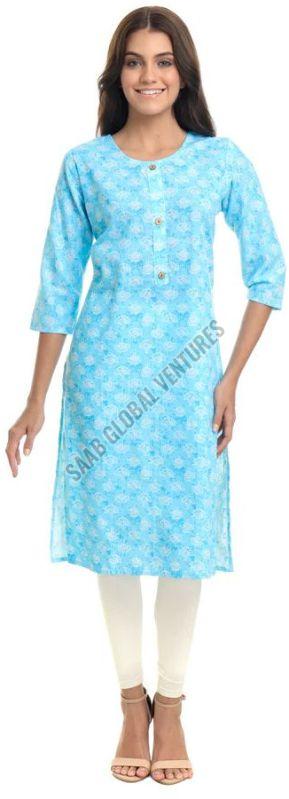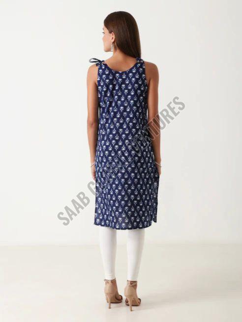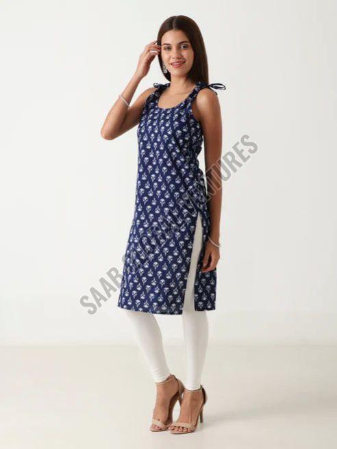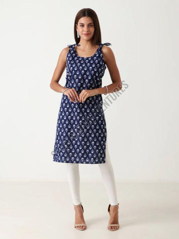 This blue printed knee-length kurti features a classic round neckline and trendy shoulder tie-up dori straps, giving it a playful and feminine touch. Made from breathable, soft cotton fabric, it’s the perfect choice for daily wear, office wear, or casual summer outings.
