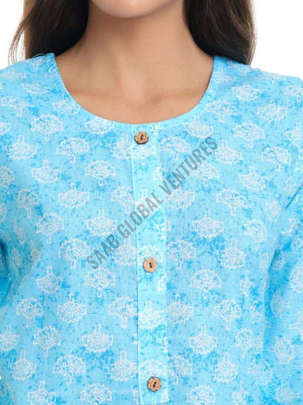 Tailored in pure, breathable cotton, this A-line knee-length kurti offers a relaxed yet elegant silhouette. The soft sky blue base with subtle white prints evokes calm and freshness, making it perfect for sunny days, light outings, or even a stylish workday look. With a classic round neck and three-quarter sleeves, it delivers effortless comfort with graceful appeal.