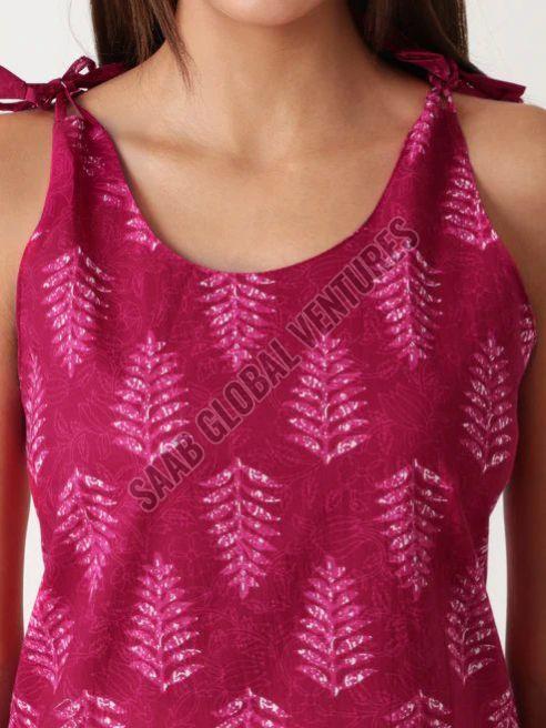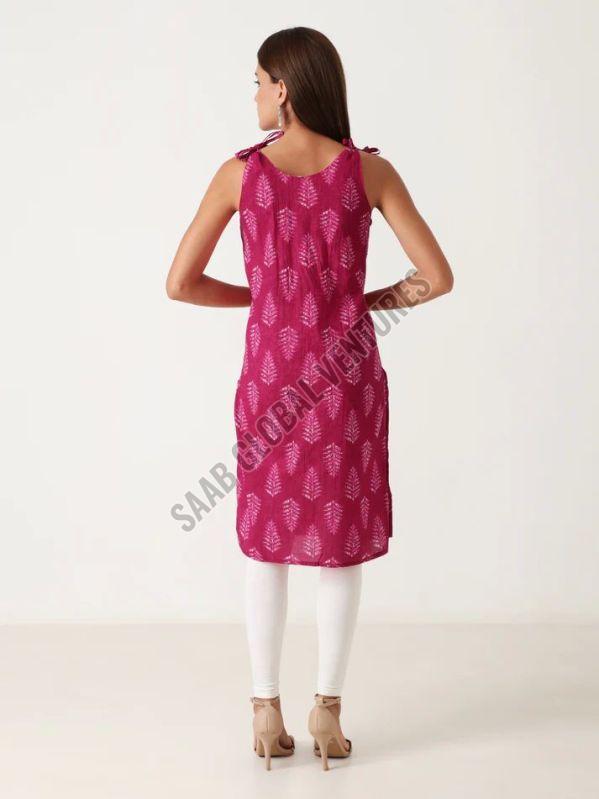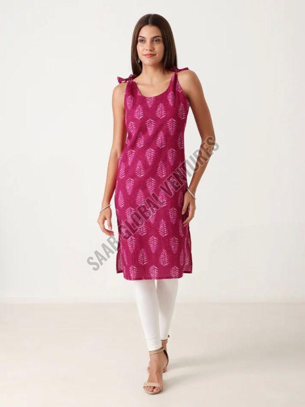 Made from 100% pure cotton, this knee-length straight-fit kurti features a round neckline and dori tie-up shoulder straps, offering breathable comfort and chic appeal. The deep maroon hue paired with a delicate printed design makes it perfect for summer wear, office looks, or daily casual outfits.