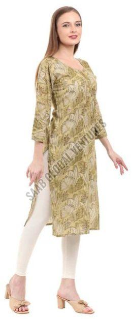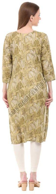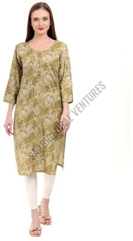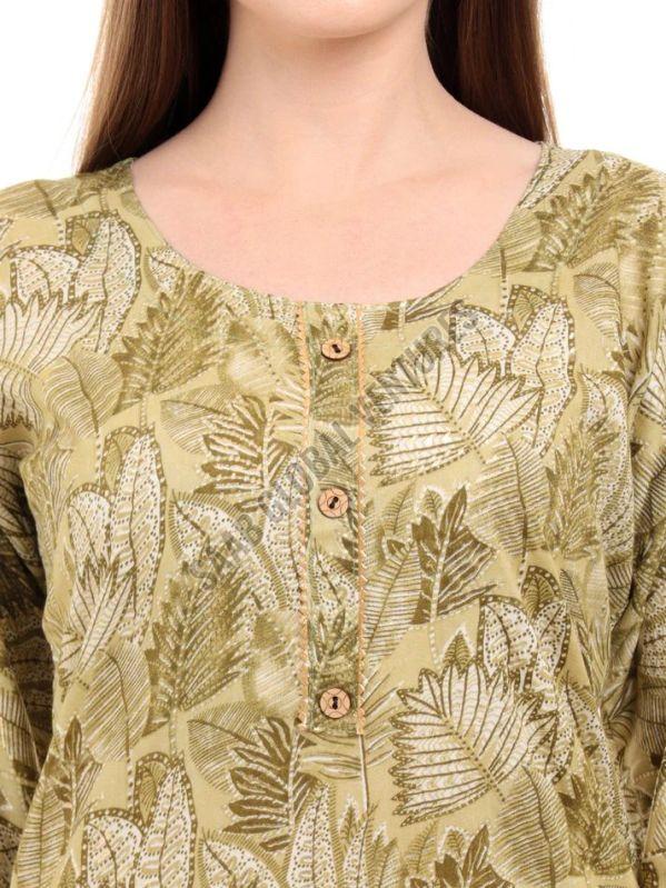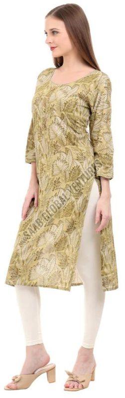 Embrace the tranquility of nature with Varnnan's Olive Leaf A-Line Kurti. Crafted in a soothing green hue, this calf-length kurti features delicate leaf prints that exude timeless charm. The A-line silhouette offers a flattering fit, while the round neckline and three-quarter sleeves provide classic elegance.