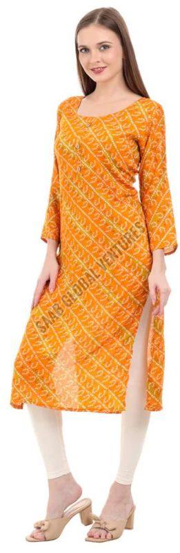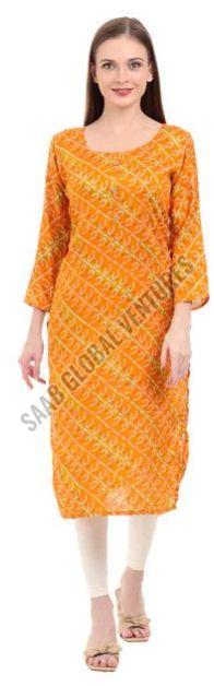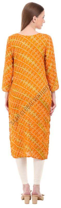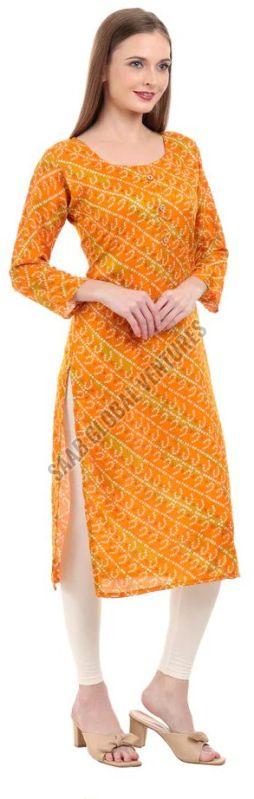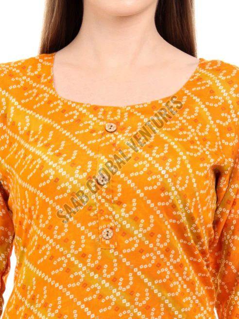 Embrace the vibrant traditions of India with Varnnan's Sunshine Bandhani A-Line Kurti. Crafted from soft, breathable cotton, this calf-length kurti features intricate Bandhani prints in a radiant yellow hue, symbolizing joy and festivity. The A-line silhouette offers a flattering fit, while the round neckline and three-quarter sleeves provide classic elegance.