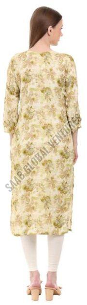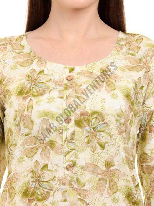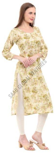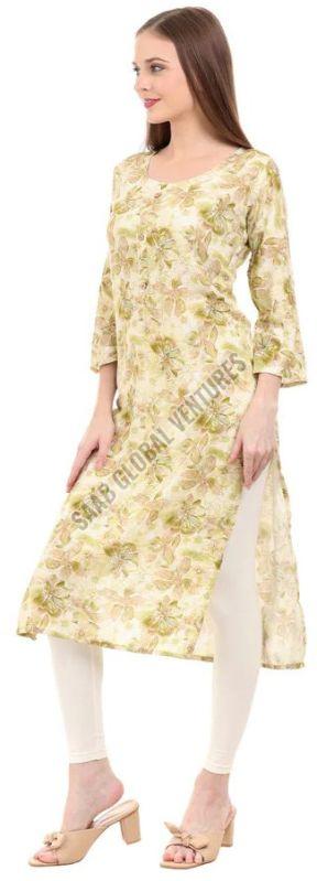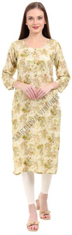 Crafted from breathable Viscose Rayon fabric, this A-line calf-length kurti features a soft floral print in a serene white color combination, highlighted by a classic round neckline and three-quarter sleeves for an effortlessly feminine silhouette.