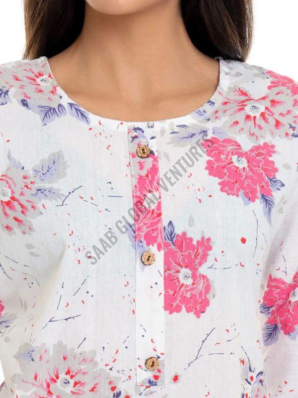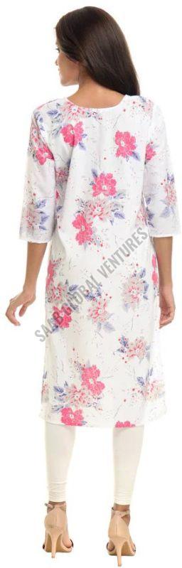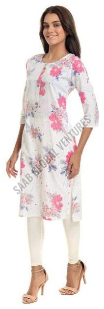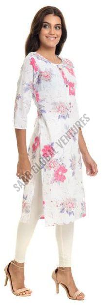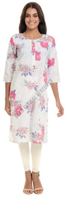 Made from pure, breathable cotton, this A-line knee-length kurti features a serene white base adorned with soft pink floral prints, offering a graceful yet playful look. With its classic round neckline and three-quarter sleeves, it’s perfect for sunny outings, light office wear, or a casual brunch with friends.